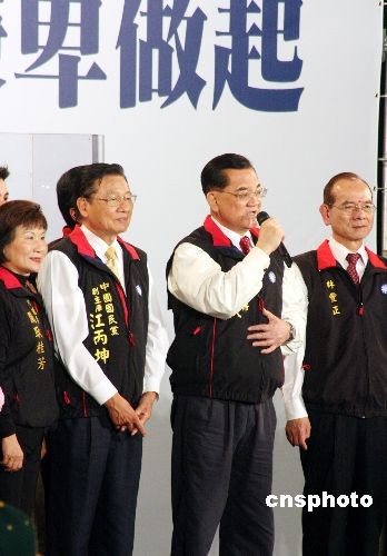 3月22日,中國國民黨候選人馬英九、蕭萬長在臺灣地區(qū)領(lǐng)導(dǎo)人大選中以221萬票的領(lǐng)先優(yōu)勢獲勝,大批支持者在馬蕭競選總部前集會歡慶。圖為中國國民黨榮譽主席連戰(zhàn)在集會現(xiàn)場發(fā)表演講。中新社發(fā) 黃少華 攝