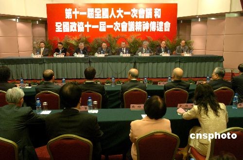 三月二十五日,“第十一屆全國人大一次會議和全國政協(xié)十一屆一次會議”精神傳達會在澳門世貿(mào)中心舉行,澳門中聯(lián)辦主任白志健、澳門特首何厚鏵出席會議并發(fā)表講話。數(shù)百名澳門各屆人士聽取了出席第十一屆全國人民代表大會澳門區(qū)代表作的關(guān)于“兩會”的情況報告。中新社發(fā) 史利 攝