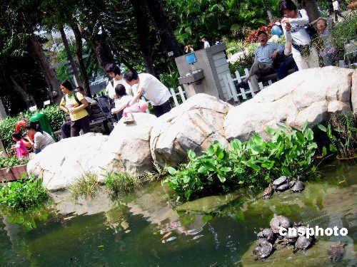 香港公園烏龜爭(zhēng)相爬上礁石享受春天陽光