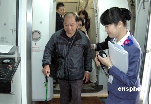四月二日中午,臺灣復(fù)興航空公司兩岸清明包機(jī)抵達(dá)廈門機(jī)場,揭開本次兩岸清明包機(jī)廈門航點(diǎn)序幕。圖為服務(wù)人員精心照料年歲較大的臺胞乘客。中新社發(fā) 陳悅 攝