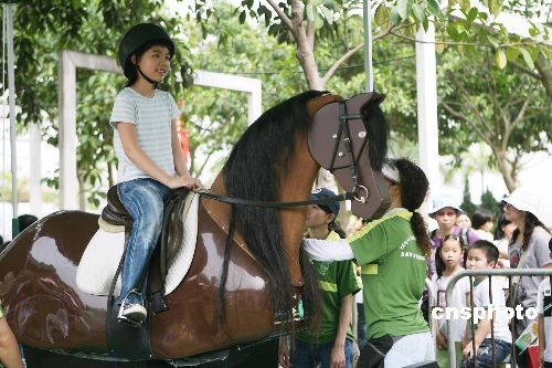 四月六日,香港大埔海濱公園舉行大埔迎奧運(yùn)嘉年華,向市民宣揚(yáng)奧運(yùn)精神,并加深對(duì)香港協(xié)辦的奧運(yùn)馬術(shù)項(xiàng)目的認(rèn)識(shí)與熱愛,中國(guó)香港體育協(xié)會(huì)暨奧林匹克委員會(huì)會(huì)長(zhǎng)霍震霆、香港民政事務(wù)局局長(zhǎng)曾德成等出席活動(dòng)。圖為小朋友通過試騎電動(dòng)馬體驗(yàn)馬術(shù)。 中新社發(fā) 武仲林 攝