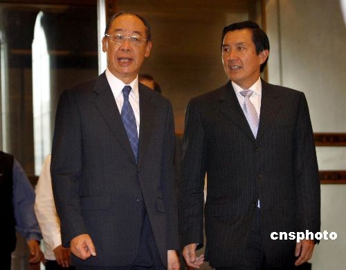 4月8日,馬英九在臺北國泰金融大樓拜會前“監(jiān)察院長”、現(xiàn)任國泰慈善基金會董事長錢復(fù)(左)。中新社發(fā) 杜洋 攝