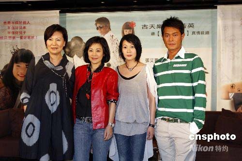 4月23日,張艾嘉(左二)帶著奶茶劉若英(右二)、古天樂,以及片中客串的港星陶敏明在臺北為愛情結(jié)晶喜劇《一個好爸爸》造勢。本片由成龍親自監(jiān)制,是張艾嘉繼《20.30.40》后籌備三年的執(zhí)導(dǎo)力作。她在此片突破常規(guī)染指黑幫的花花世界,用豐富和幽默真摯情感打動觀眾,成為導(dǎo)演生涯中最有創(chuàng)作力一次。男女主角古天樂、劉若英飾演一對經(jīng)歷廿年愛情試煉的夫妻,激情有默契,雋永而清新!兑粋好爸爸》將于4月25日在臺灣公映。中新社發(fā) 杜洋 攝