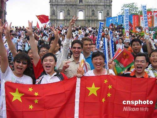 圖:澳門市民及游客大三巴牌坊前迎圣火