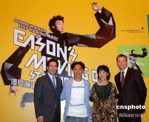 五月八日,香港歌星陳奕迅(左二)在澳門(mén)威尼斯人酒店出席個(gè)人世界巡回演唱會(huì)記者招待會(huì),介紹其個(gè)人世界巡回演唱會(huì)最后一站的澳門(mén)演唱會(huì)將于七月十九日在澳門(mén)威尼斯酒店舉行。中新社發(fā) 史利 攝