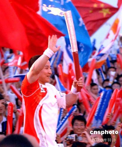5月11日18時(shí)20分,隨著北京奧運(yùn)會(huì)火炬接力境內(nèi)傳遞福建福州站最后一棒火炬手雅典奧運(yùn)會(huì)舉重冠軍石智勇跑進(jìn)福州市望龍臺(tái)公園慶祝會(huì)場(chǎng),奧運(yùn)圣火福州站傳遞圓滿結(jié)束。當(dāng)日,208名火炬手完成了28.6公里福州站的火炬?zhèn)鬟f。 中新社發(fā) 劉可耕 攝