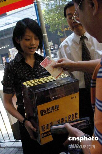 五月十四日,香港民建聯(lián)繼續(xù)在中環(huán)鬧市為四川大地震災民籌款,眾多市民及游客慷慨解囊。中新社發(fā) 譚達明 攝