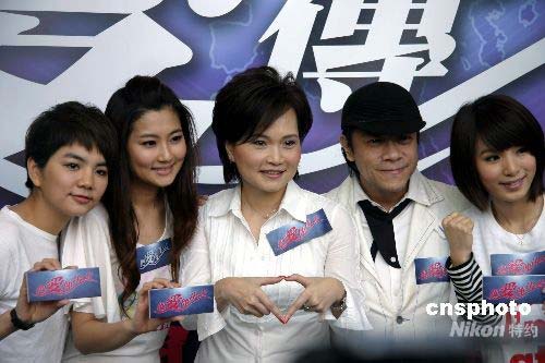臺(tái)灣演藝界人士將于18日晚共同參與四川賑災(zāi)晚會(huì)“把愛傳出去”。張小燕、張菲、吳宗憲、蔡康永、周杰倫等知名藝人接到邀請(qǐng)并積極投入晚會(huì)籌備工作,圖為名主持沈春華(中)、蔡康永(右二)與演唱組合SHE號(hào)召民眾以及更多藝人參與晚會(huì)及募款活動(dòng)。中新社發(fā) 劉舒凌 攝