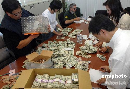 當(dāng)?shù)貢r間五月十七日,四川大地震發(fā)生后的第一個周末,在洛杉磯地區(qū)工作生活的普通華人華僑頂著華氏一百度的高溫走上街頭,為遠隔萬里的災(zāi)區(qū)同胞默默捐出一張張現(xiàn)金和支票。短短六個小時的街頭募捐活動共籌得四十萬美元。圖為羅省中華總商會會長莊佩源(左一)等人正在清點部分捐款。中新社發(fā) 張煒 攝