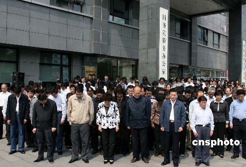 5月19日,國務(wù)院僑務(wù)辦公室全體機(jī)關(guān)干部為四川汶川大地震罹難同胞默哀。2008年5月19日至21日為全國哀悼日。中新社發(fā) 張勤 攝