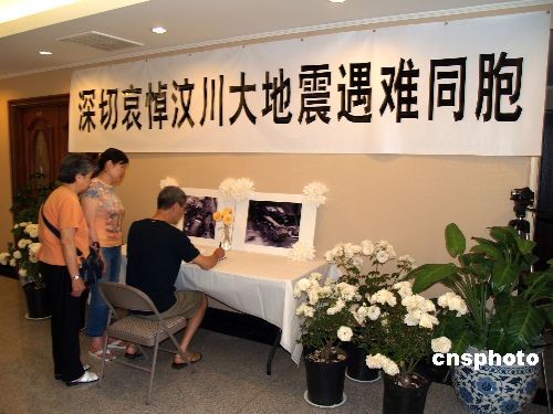 5月19日,中國駐洛杉磯總領(lǐng)事館開設(shè)“中國汶川地震遇難同胞悼念堂”,眾多華人華僑前來向遇難同胞鞠躬默哀,表示深切哀悼,并在悼念本上留下自己感言。