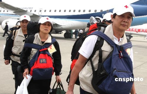 5月20日下午,以陳文長為領(lǐng)隊的臺灣紅十字醫(yī)療隊一行37人以“兩岸直航”的形式乘坐臺灣華信航空的專機抵達成都機場,之后即刻前往汶川大地震的重災(zāi)區(qū)德陽市開展醫(yī)療救治。中新社發(fā) 任晨鳴 攝