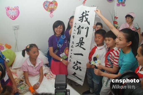 5月31日,“閩臺少兒心系災區(qū)”手拉手活動在福州進行,來自臺灣澎湖馬公小學的80名同學將陸續(xù)與汶川災區(qū)的轉院小傷員見面。圖為3名馬公小學學生代表來到了南京軍區(qū)福州總醫(yī)院看望災區(qū)小朋友林玉如,贈送了親手制作的小荷包等禮物,并合唱了一首《童話》。中新社發(fā) 吳志 攝