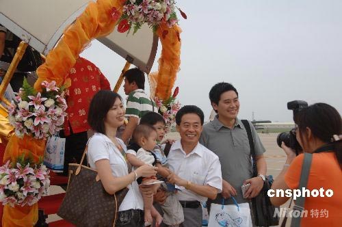 7月4日上午,臺胞羅先生(左一至四)一家四口,在廈門喜乘周末包機返臺,登機之時在飛機舷梯前合影留念,以保存兩岸周末包機首航的歷史瞬間。中新社發(fā) 鄭祚聲 攝