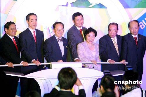 七月三日,為慶祝香港國際機(jī)場啟用十周年,機(jī)場管理局在港麗酒店舉行慶典及酒會,香港特區(qū)行政長官曾蔭權(quán)、政務(wù)司長唐英年、機(jī)場管理局主席張建東等嘉賓主持慶典儀式。中新社發(fā) 洪少葵 攝