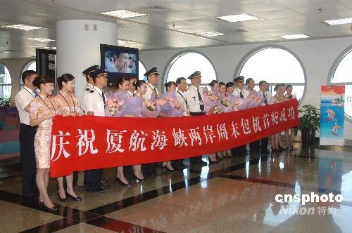 7月4日,作為首架降落臺(tái)北松山機(jī)場大陸民航客機(jī),從松山乘載202位客人返抵廈門高崎場后,廈航MF-881班機(jī)全體駕乘人員合影慶賀往返分別以80分鐘時(shí)間正點(diǎn)執(zhí)乘。機(jī)長沈志群介紹,航班抵達(dá)臺(tái)北松山機(jī)場時(shí),受到當(dāng)?shù)馗鹘缫浴坝L(fēng)洗塵”為主題的禮遇迎接。中新社發(fā) 鄭祚聲 攝