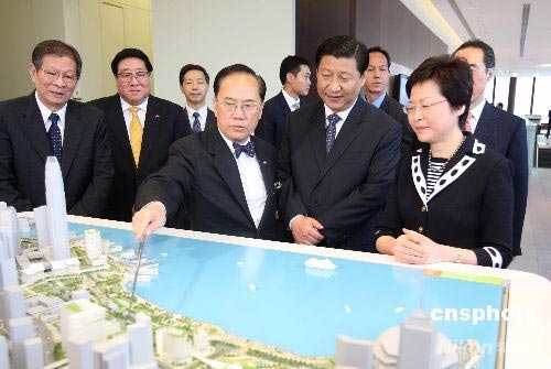 七月七日,首次訪問(wèn)香港的國(guó)家副主席習(xí)近平,來(lái)到金融管理局參觀貨幣及銀行體系展覽,同時(shí)了解港粵、港深合作情況。中新社發(fā) 任海霞 攝