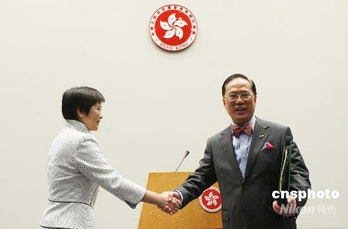 七月十二日,國務(wù)院決定,任命劉吳惠蘭為香港特別行政區(qū)商務(wù)及經(jīng)濟(jì)發(fā)展局局長,免去馬時亨的商務(wù)及經(jīng)濟(jì)發(fā)展局局長職務(wù)。圖為當(dāng)日香港特別行政區(qū)行政長官曾蔭權(quán)與劉吳惠蘭在政府總部出席記者會。中新社發(fā) 武仲林 攝