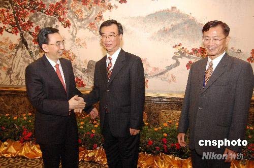 中國國民黨高雄市委員會廣州訪問團(tuán)一行,七月十二日搭乘高雄至廣州周末包機(jī)抵穗。中共廣州市委書記朱小丹(左一),在廣州東方賓館會見該訪問團(tuán)全體成員。中新社發(fā) 柯小軍 攝