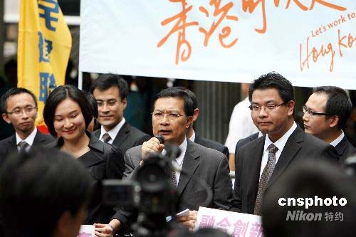 七月十七日,香港民建聯(lián)在遮打花園造勢(shì),向傳媒介紹二十九位參加九月的立法會(huì)地區(qū)直選的參選人。香港民建聯(lián)主席譚耀宗表示,希望在九月的立法會(huì)選舉中,能保持十二個(gè)席位的數(shù)目。中新社發(fā) 洪少葵 攝