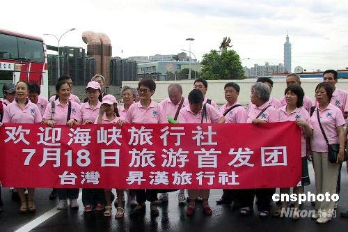大陸居民赴臺旅游十八日正式實(shí)施,首批游客從臺北松山機(jī)場入境抵臺。這也標(biāo)志著各界期盼已久的大陸居民赴臺游開始步入常態(tài)化。圖為從松山機(jī)場出站的大陸游客在機(jī)場合影。中新社發(fā) 徐長安 攝