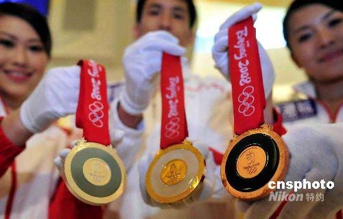 七月二十四日,北京奧運會采用的“金鑲玉” 獎牌在香港展示。獎牌正面用國際奧委會規(guī)定圖案,背面鑲嵌著中國古代龍紋玉璧造型的玉璧,背面正中鐫刻北京奧運會徽。中新社發(fā) 譚達(dá)明 攝