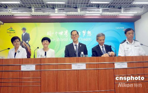 九月二日,香港特區(qū)政府就北京二零零八年殘奧馬術(shù)比賽項(xiàng)目的準(zhǔn)備工作舉行記者會(huì),香港民政事務(wù)局局長(zhǎng)曾德成、奧運(yùn)馬術(shù)公司行政總裁林煥光、香港殘疾人奧委會(huì)暨傷殘人士體育協(xié)會(huì)主席馮馬潔嫻、運(yùn)輸署助理署長(zhǎng)(新界)羅鳳屏和警察公共關(guān)系科總警司吳家聲向媒體公布相關(guān)事宜。中新社發(fā) 鄧慶樂 攝