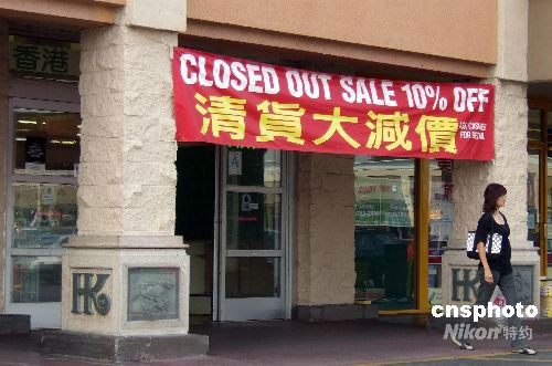 位于美國洛杉磯縣西柯汶那市的香港超市,近日掛出“清貨大減價”的橫幅,將于近期停業(yè)。在洛杉磯華人聚居區(qū),香港超市是華人經(jīng)常光顧的連鎖超市,受到美國經(jīng)濟不景氣和物價上漲等因素影響,當(dāng)?shù)厝A人消費能力下降,一些經(jīng)營業(yè)績不佳的華人商鋪和超市被迫關(guān)門歇業(yè)。中新社發(fā) 張煒 攝