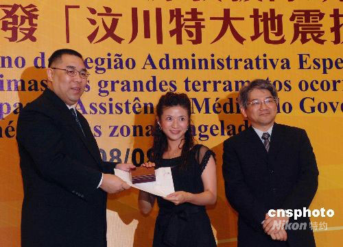 澳門特區(qū)政府社會文化司司長崔世安(左)及衛(wèi)生局局長李展?jié)?右)九月三日晚向澳門援助四川地震災區(qū)的三批五十六名醫(yī)護人員逐一頒發(fā)獎狀及四川省政府贈送的“抗震救災紀念章”,以表彰他們的貢獻。中新社發(fā) 畢永光 攝