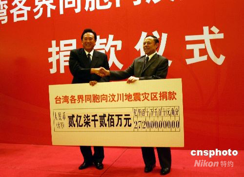 圖:陳云林向汶川地震災(zāi)區(qū)轉(zhuǎn)交臺胞2.7億捐款