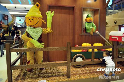九月十日,雖然尚有一個多月才到萬圣節(jié),香港一商場已布置不少鬼怪造型,引來市民注目或拍照。中新社發(fā) 譚達明 攝