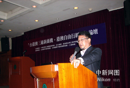 圖為澳門物流貨運(yùn)聯(lián)合商會(huì)理事長李國輝向臺(tái)灣業(yè)界介紹內(nèi)地開放自由行后對促進(jìn)澳門物流零售業(yè)的幫助及相應(yīng)的運(yùn)營經(jīng)驗(yàn)。