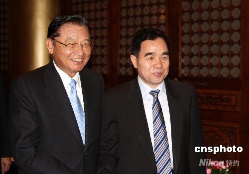 9月19日,臺(tái)灣海基會(huì)董事長(zhǎng)江丙坤在臺(tái)北圓山飯店,會(huì)見率團(tuán)前來臺(tái)灣參加海峽兩岸出版交流二十周年紀(jì)念活動(dòng)的部分大陸代表團(tuán)成員時(shí),與新聞出版署署長(zhǎng)柳斌杰(右)在一起。中新社發(fā) 陳立宇 攝