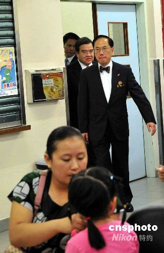 香港特區(qū)行政長官曾蔭權(quán)二十三日下午,前往油麻地賽馬會分科診所,了解受三聚氰胺奶品事件影響兒童的檢驗情況。中新社發(fā) 譚達明 攝