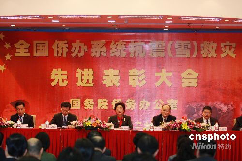 9月28日,國務(wù)院僑辦在北京召開僑辦系統(tǒng)抗震(雪)救災(zāi)先進表彰電視電話會議,對全國僑辦系統(tǒng)在抗震(雪)救災(zāi)斗爭中表現(xiàn)突出的50個先進集體和100名先進個人予以表彰。中新社發(fā) 鄭雄增 攝