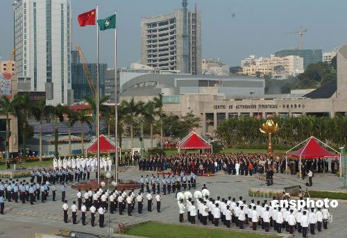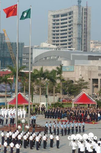 十月一日上午八時,澳門各界在金蓮花廣場舉行隆重升國旗、區(qū)旗儀式,慶祝中華人民共和國成立五十九周年。中新社發(fā) 畢永光 攝