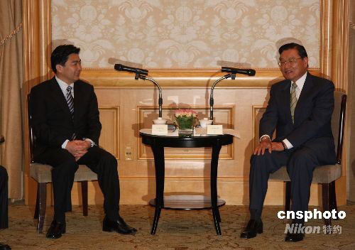 臺(tái)灣;鶗(huì)董事長江丙坤(右)十月一日在臺(tái)北西華飯店會(huì)見前來臺(tái)灣參訪的中共江蘇省委常委、蘇州市委書記王榮。經(jīng)常到蘇州看望臺(tái)商的江丙坤,希望蘇州在中小臺(tái)資企業(yè)融資、勞動(dòng)合同法的實(shí)施及臺(tái)資企業(yè)后續(xù)發(fā)展的土地三個(gè)問題上,更多地向臺(tái)商提供輔導(dǎo)和協(xié)助。中新社發(fā) 耿軍 攝