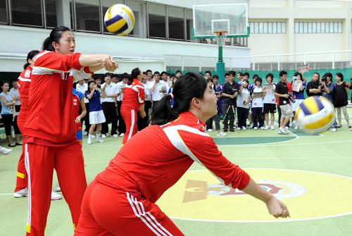 中國(guó)女排在香港新法書院與學(xué)生進(jìn)行交流,展示了她們的精湛球技。新華社記者盧炳輝攝