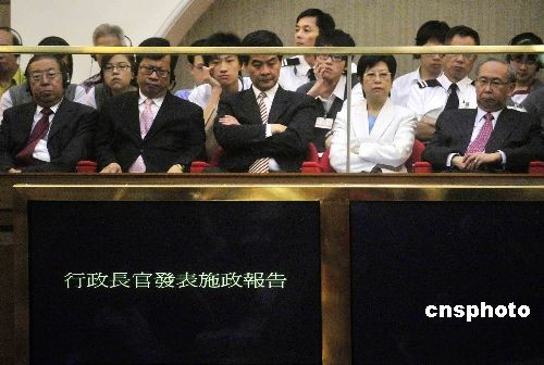 十月十五日,香港行政長(zhǎng)官曾蔭權(quán),在立法會(huì)發(fā)表二零零八至零九年施政報(bào)告。特首夫人曾鮑笑薇及多位行政會(huì)議成員出席旁聽。中新社發(fā) 譚達(dá)明 攝