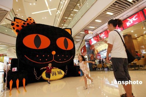 臨近西方萬圣節(jié),香港一些商場為催谷顧客消費(fèi),紛紛布置應(yīng)屆裝飾吸引人流。圖為兩名小童在奧海城萬圣節(jié)布景前嬉戲玩耍。中新社發(fā) 洪少葵 攝