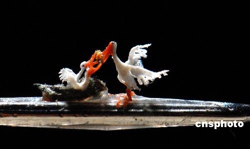 圖為臺(tái)灣著名微雕家陳逢顯的新作“母愛(ài)真情”。放在針孔上,只有小沙粒那么大。陳逢顯說(shuō),這是他應(yīng)大陸微雕界人士的邀約,為慰問(wèn)汶川大地震受災(zāi)同胞而作。中新社發(fā) 陳立宇 攝