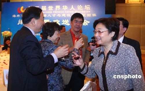 10月29日晚,第五屆世界華人論壇在北京閉幕。國務院僑辦主任李海峰出席歡送宴會并向參會代表們敬酒致意。中新社發(fā) 廖文靜 攝