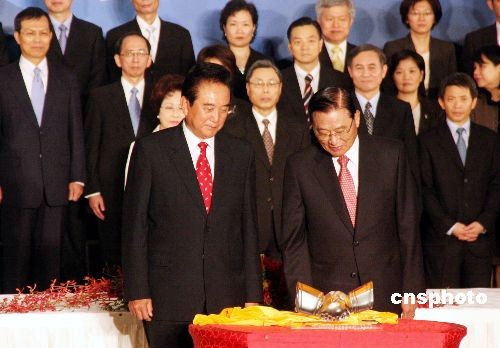 11月4日下午,海協(xié)會會長陳云林和;鶗麻L江丙坤簽署有關(guān)兩岸空運(yùn)直航、海運(yùn)直航、郵政、食品安全的4項(xiàng)協(xié)議。圖為協(xié)議文本簽署后,陳云林向江丙坤致贈水晶作品《握手》。中新社發(fā) 黃少華 攝