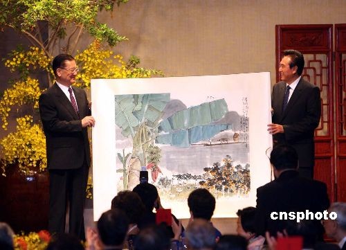 連戰(zhàn)依照習(xí)俗向陳云林[右]送上名產(chǎn)作為手禮,并送贈一幅表現(xiàn)臺灣鄉(xiāng)村風(fēng)貌的書畫。