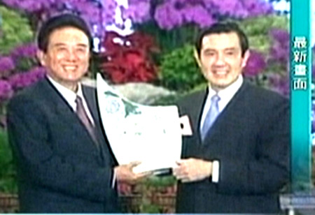 11月6日上午,馬英九與海協(xié)會(huì)會(huì)長(zhǎng)陳云林一行會(huì)面,并互贈(zèng)禮物。