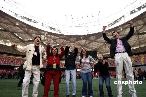 參加“2008年海外華裔青年杰出人士華夏行”活動(dòng)的代表參觀國(guó)家體育場(chǎng)“鳥巢”。