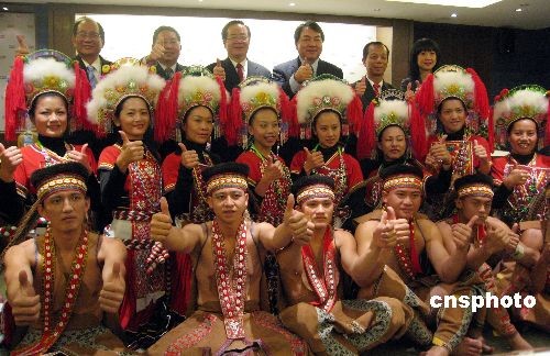 受兩岸兩會(huì)在臺(tái)北簽署四項(xiàng)協(xié)議等利多因素影響,11月19日,臺(tái)灣觀光業(yè)者首次大規(guī)模組團(tuán)“登陸”上海,參展“二00八中國(guó)國(guó)際旅游交易會(huì)”。臺(tái)灣觀光協(xié)會(huì)組織的三百余名業(yè)者及相關(guān)機(jī)構(gòu)代表甫抵上海,在臺(tái)商聚集的福泰商務(wù)酒店召開記者會(huì)。圖為臺(tái)灣南投縣九族文化村的少數(shù)民族歌舞團(tuán)隊(duì)亮相記者會(huì),表達(dá)臺(tái)灣民眾的好客之情。中新社發(fā) 許曉青 攝