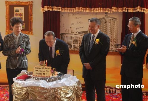 “葡京三十八載劃時(shí)代輝煌展” 十一月二十五日在澳門葡京酒店開(kāi)幕,欣逢澳門博彩股份有限公司行政總裁何鴻燊(左二)八十七歲生日。圖為何鴻燊在嘉賓祝福聲中吹熄蛋糕上的蠟燭。中新社發(fā) 畢永光 攝