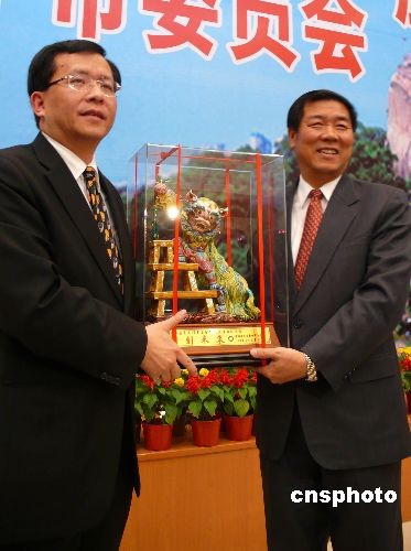 12月1日,中國(guó)國(guó)民黨臺(tái)中市委員會(huì)主委張逸華(左)率領(lǐng)參訪團(tuán)一行23人蒞廈參訪。這是國(guó)共兩黨展開基層黨務(wù)交流以來(lái)廈門與臺(tái)中市之間第3次互訪。圖為中共廈門市委書記何立峰(右)會(huì)見海峽彼岸貴賓之后雙方互贈(zèng)禮物。中新社發(fā) 楊伏山 攝