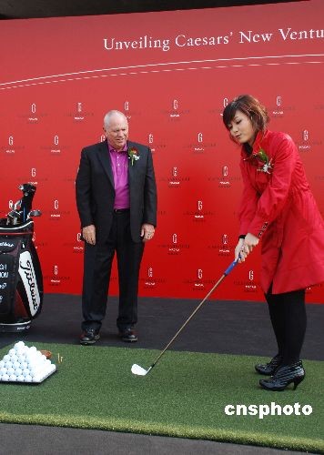 美國哈樂斯娛樂公司十二月十六日在澳門公布“凱撒高爾夫”發(fā)展計劃,包括開設(shè)亞洲首間布奇哈蒙高爾夫?qū)W校以及對現(xiàn)有高爾夫球場的提升改造。圖為著名高爾夫球教練布奇·哈蒙指導(dǎo)“澳門小姐”呂蓉茵揮桿動作。中新社發(fā) 畢永光 攝